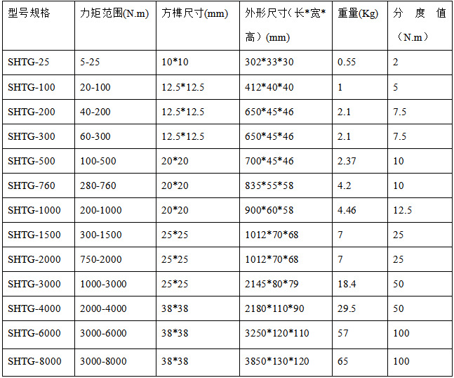 产品详情:SHTG预置式扭力扳手是我公司研发生产的具有国际先进水准的下一代高品质扭矩扳手,产品系列完备,具有精度高,外形美观,使用便捷,可靠性好,可更换头等特征。普遍应用于航天,航空,造船,汽车,铁路,工程机器,电力等行业。它是保证和提高产品质量的举足轻重工具。精度为±4%。我公司也可根据要求调整为±3%。
